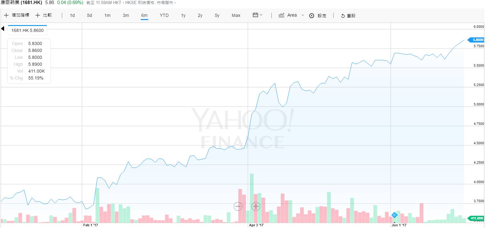 从2017年起,康臣在短短六个月的时间里狂涨50%,从约3.7港币的价位到现在5.7港币,可谓是给市场下了“猛药”。