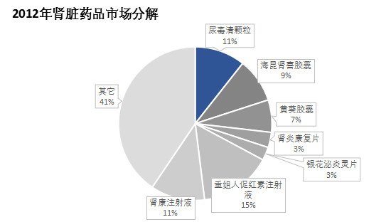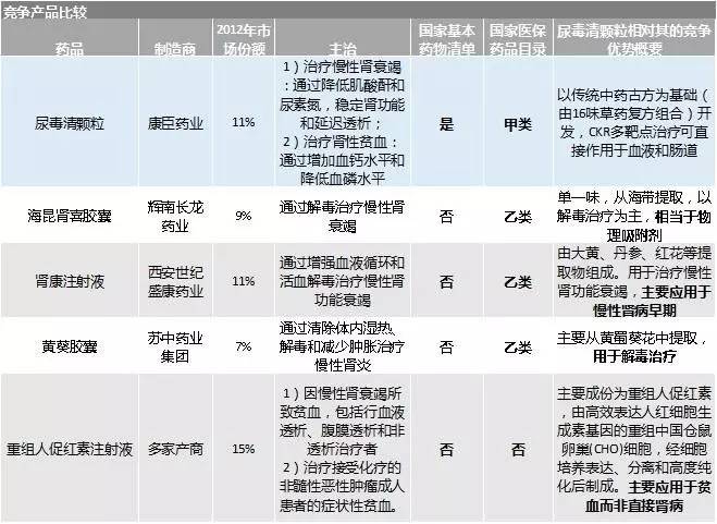 再对比其主要竞争者,即其它口服药"海昆肾喜"等,"尿毒清"是唯一一个通过循证医学实验,医保100%报销(“海昆肾喜”刚列入乙类,90%左右的报销比例),列入国家基本药物名单的(医院倾向于使用国家基药)。