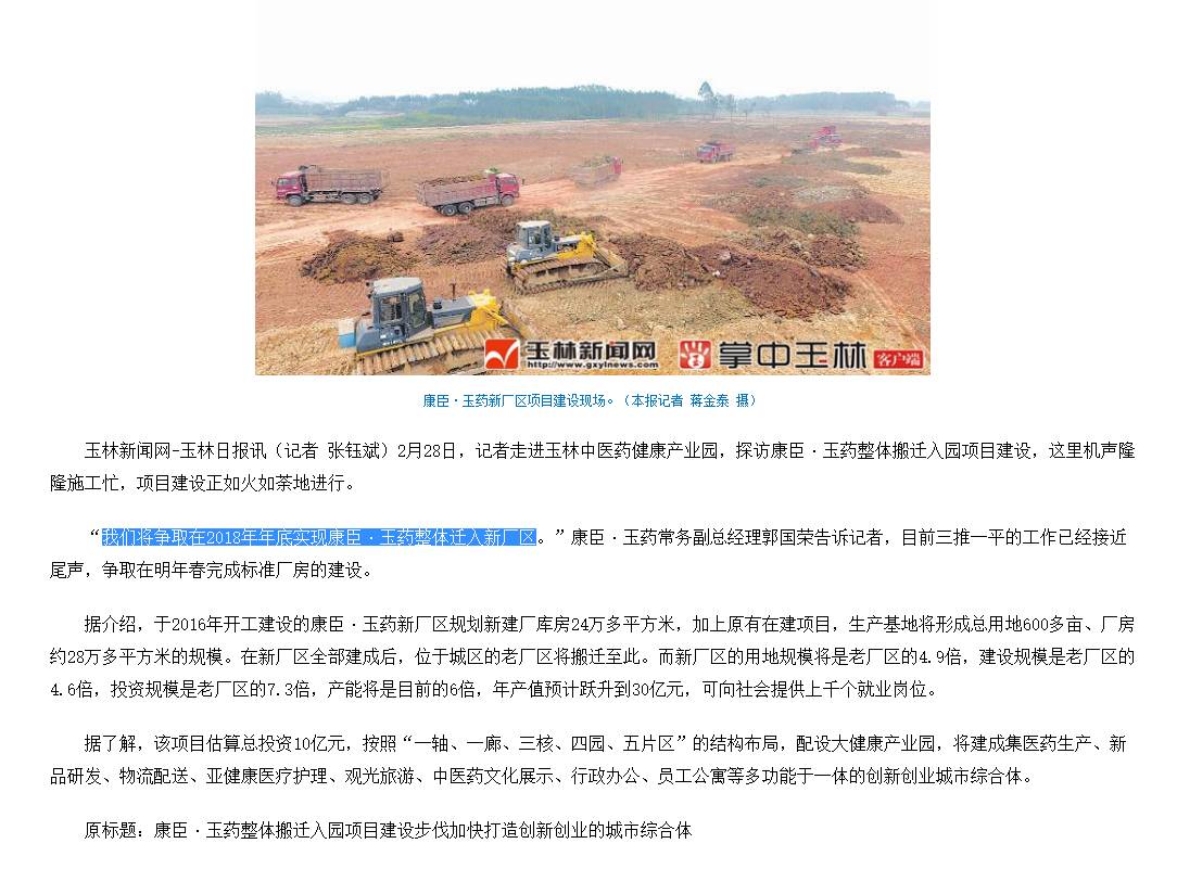 玉林于2016年底开始工厂搬迁项目,“退城入园”,其原来处于玉林市中心的老厂房计划搬迁至玉林中医药健康产业园,产能预计将大大扩大。