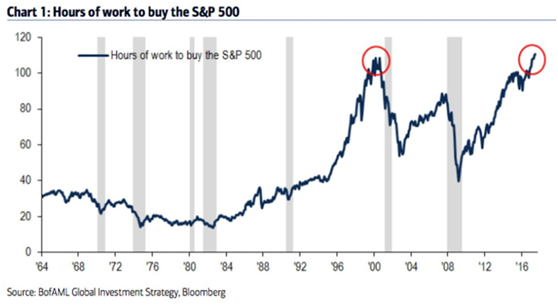 另外一个特别有意思的视角是劳动力工作时间与股市市值的关系,现在要买标普500所需的劳动力时间也处于历史高位: