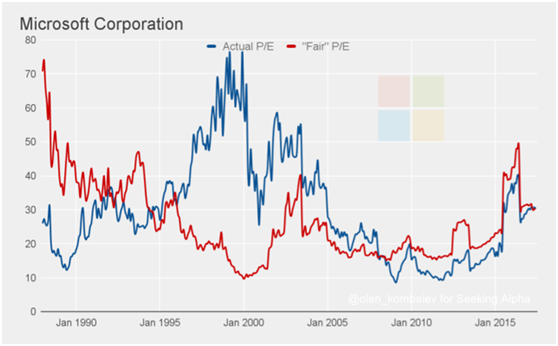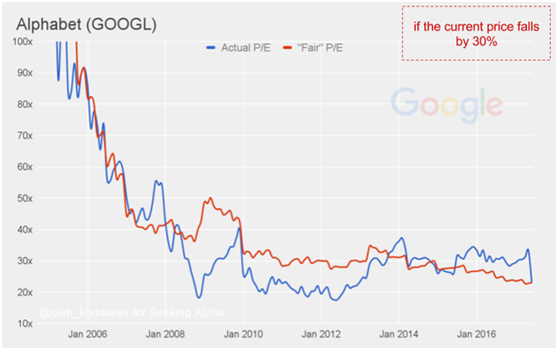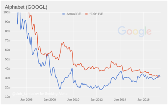 谷歌的很明显,公允PE低于实际PE,除了去年。也就是说长期投资者仍然会有超过最低要求的回报率。