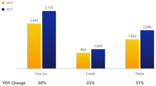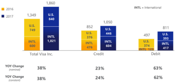 公司通过每张信用卡从每笔交易中收取一定的费用,这种收费站式的业务,只要交易量流水多,那么公司就会从获得的利润就更多。随着全球商务的发展,以及互联网零售的爆发,公司无论是从现金还是支票,亦或是电子支付中都获益匪浅。