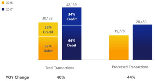 公司发卡量在今年保持稳定增长,借记卡同比增长了23%,信用卡同比增长了31%,公司总卡量上升了28%。