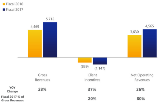 总体上而言,随着公司业务指标的提升,伴随而来的就是公司业绩的提升,公司毛收入同比增长28%,净运营收入提升了26%。但是,投资者有一点需要注意,就是公司虽然今年本季度业务方面提高迅猛,但是公司的运营利润有所下滑,所幸的是,下滑幅度较小,仅为2%,由此前的68%下降到66%。