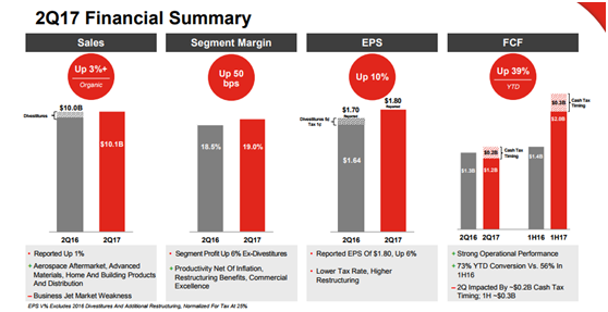 公司对第三季度的预期很乐观,营收和利润率预期都将大幅增长,预期EPS同比增长13%-16%,为每股1.7-1.75美元;同时提高了2017全年业绩预期,EPS同比上升8%-10%,至7-7.1美元;营收393-400亿美元,同比持平或上升2%;自由现金流46-47亿美元,同比上升5%-7%。