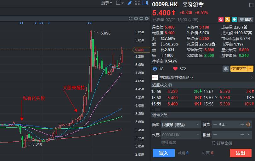 私有化失败后下挫近17%。但一个月后,大股东罗苏开始于场内增持公司股票,第一次增持40万股,之后再增持55万股。在罗苏增持不久,伴随着铝价的上涨兴发铝材这次成为了板块龙头,创出5.89港元的历史新高,远远超越大股东的私有化价格。
