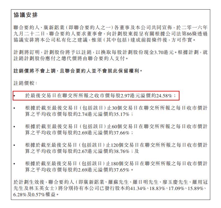 2016年9月23号,兴发铝材发布公告,联合要约人(即广新铝业、罗苏、罗日明、廖玉庆、罗用冠及林玉英)建议透过协议安排将公司私有化,每股注销价为现金3.70港元,价格将不会上调。