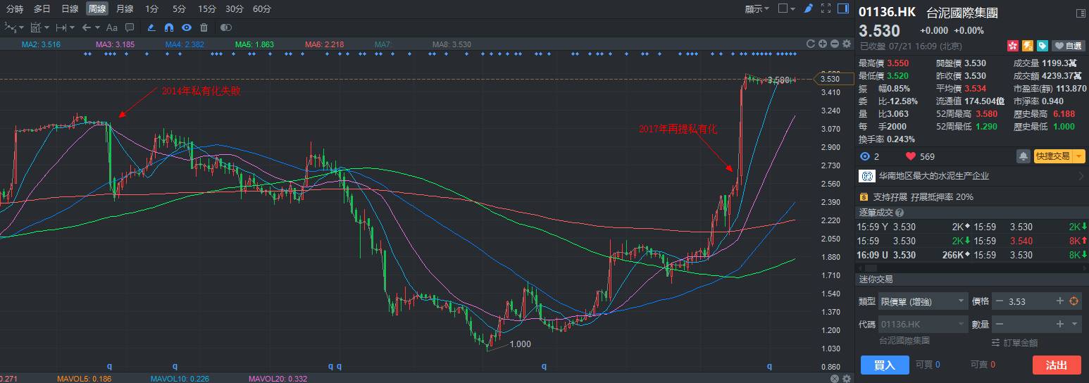 2014年4月21日台泥大股东提出溢价4成3.9港元私有化,但是由于二股东嘉新水泥否决私有化失败。