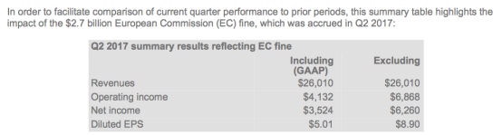 下图对比了计入和不计入欧盟罚款情况下谷歌2017年二季度的相关财务数据: