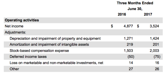 从图中可以看出,谷歌2017年第二季度业绩表现受到欧盟罚款的影响十分巨大。下图是谷歌2017年第二季度和2016年第二季度财报部分数据:
