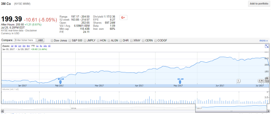 全球性的多元化科技企业3M公司( Minnesota Mining and Manufacturing,明尼苏达矿务及制造业公司,下文简称3M)昨日发布了2017年第二季度财报。由于在美国市场的产品定价疲软,公司季度营收和利润双双不及预期,财报表现欠还佳拖累公司股价下跌5.05%,创下1972年以来最大单日跌幅。