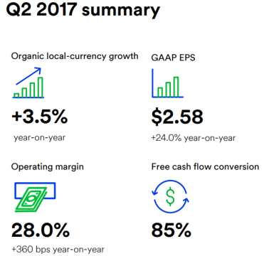 以美元计算,有机营收同比增长3.5%。按不同地理区域划分,美国地区有机营收同比增长1.9%;亚太地区同比增长10%,其中中国和香港同比增长17%,日本同比增长8%;EMEA地区(欧洲、中东和非洲地区)同比下滑1.6%,其中西欧地区同比下滑2%;拉丁美洲和加拿大地区同比增长3.7%,其中加拿大、墨西哥和巴西分别同比增长3%、8%和6%。