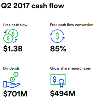 3M第二季度持有的自由现金流为13亿美元,同比增长3.78亿美元,这主要得益于现金税率的降低。公司将2017财年自由现金流转化比率从之前预计的95%至105%略微下调至95%至100%。二季度资本支出为3.02亿美元,同比持平。公司预计2017财年的资本开支范围将在13亿美元至15亿美元之间。此外,公司还下调了2017全年用于股票回购的金额,从之前预期的25亿美元至45亿美元下调至20美元至35美元。