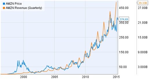 回顾亚马逊历史,股价和销售额的增长曲线都完美地重叠在一起。