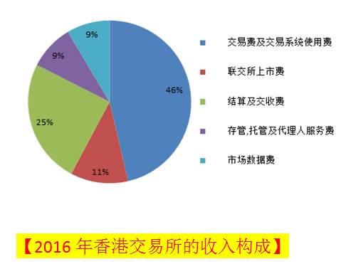 根据2016年港交所的年报数据显示,港交所的收入主要来源于5个部分,其中交易费及交易系统使用费和结算交收费两个部分共占收入来源71%。