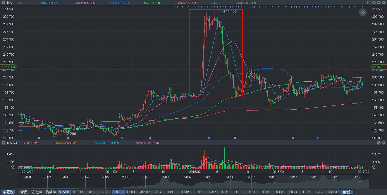 2015年港股大时代,当年3月~5月,恒生指数升幅为20%,同时间段,港交所股价由174.1元升至最高达到311.4元,升幅达79%。