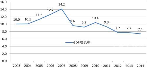 2003年中国GDP进入增长率双位数字年代,一直维持到2007年到达14.2%。
