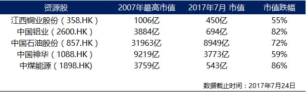从上图表可见,即使十年过去,这批资源股的市值跟2007年高峰时期相差仍然高达50%或以上。