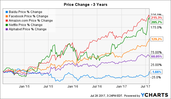 令人吃惊的是,自2014年创下220美元的记录新高之后,百度的股价一直未有起色。而在同一时期,美国科技巨头的股价飞涨,被称之为FANG的四大科技股,分别为脸书(NASDAQ:FB)、亚马逊(NASDAQ: AMZN)、奈飞(NASDAQ: NFLX)和谷歌的母公司Alphabet (NASDAQ:GOOG) ( NASDAQ:GOOGL),这些公司的股价在此期间翻了3倍。与此同时,它们也与百度一样,投入大量资金为公司的未来发展铺路。