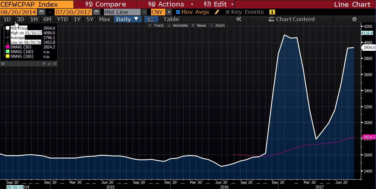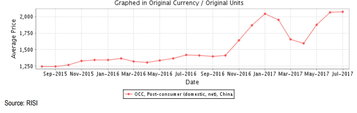 下图以华东瓦楞纸价格走势作参考,由2014-2015年的不足人民币2600/吨,到本年初曾一度升愈4000/吨。虽然自旺季过后曾大幅回落,但第二季开始又重拾升轨。