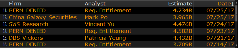 各投行对理文2017年全年纯利预测:(盈喜后取5间平均数为43亿,上调23%)