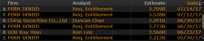 各投行对理文2017年全年纯利预测:(盈喜前取6间平均数为35亿)