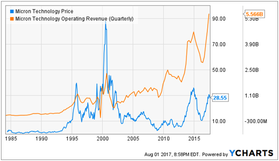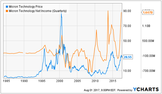 美光平时的日成交量大概是2885万股,但是7月31日有4000+万股换手,可以看出近期下跌的势头。下图分别是2001年暴涨之后公司股价与运营收入,股价和净利之间的关系,可以看出公司股价对基本面的变化反应较为缓慢。