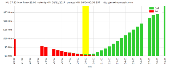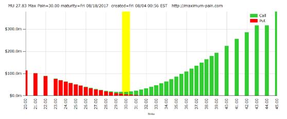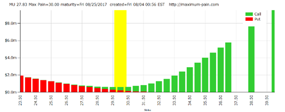 制约美光股价的一大因素就是期权,下面是9月将到期的期权未平仓合约量,可以看到9月的最痛点价位是29美元和30美元,如果真要收割期权,股价往上可能是很大的压制了。总体而言,股价短时间大幅上涨的可能性不大,对公司不很熟悉的投资者可以做好风险控制。