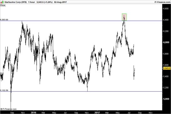 6个月后,星巴克的股价确实创下新高,但就如我们所看到的,股价随后迅速回落,如期走低。以下是更新之后的股价走势图: