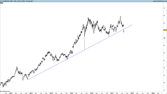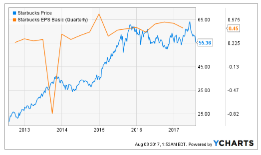 自2017财年第三季度盈利报告公布之后,星巴克(NASDAQ:SBUX)的股价大幅下跌。你可以将它归咎于公司季度营收不及预期,但从星巴克过去两年的股价走势来看,问题可能远不止如此。