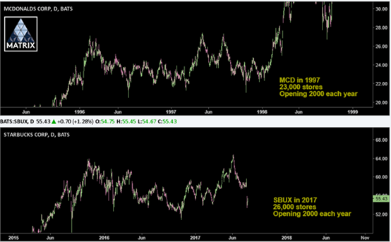这篇文章将2016年的星巴克与1997年的麦当劳作对比,当时麦当劳也经历着非常类似的成长痛。尽管麦当劳餐厅以每年2000家的速度增长(这与当下星巴克的增速非常一致),但公司的股价却连续18个月停滞不前。