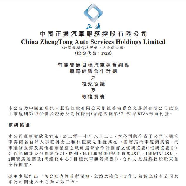 根据正通的公告,公司与两名独立第三方,就其在中国宝马汽车经销业务、汽车维修服务及其他相关业务的战略经营合作计划订立框架协议。