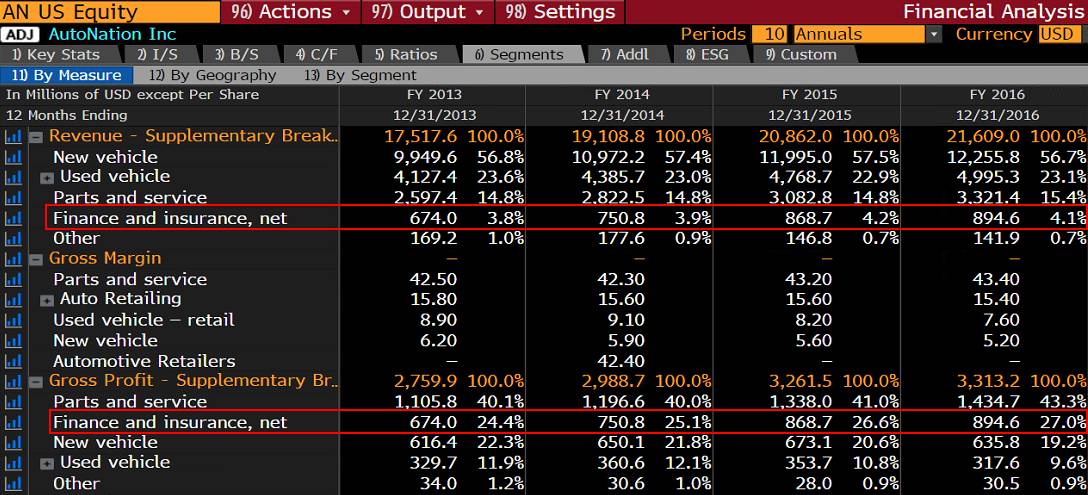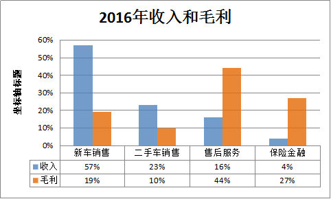 如果参考美国最大的汽车经销商AutoNation在2016年的收入结构也能得出类似答案,4%的汽车金融与保险收入占到毛利27%,毛利率更高达100%(收入是净利差和保费分成形式,销售费用没计算入内)。