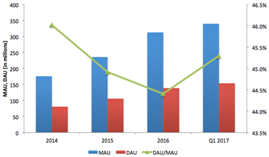 微博是中文内容领先的社交媒体,公司月活达到3.4亿,日活达到1.54亿。通过下表可以看出,公司月活和日活在近三年以来均保持上升趋势;在经历了15和16年日活和月活比值下降后,公司在今年重新焕发活力,日活月活比值上升,用户黏性加强。有报告显示,中国互联网用户在2016年6月已经达到7.1亿,这就意味着,微博已经渗透到接近一半的互联网用户。