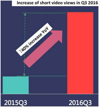 同时,视频和直播流正在发力,从下图可知,去年三季度短视频观看次数同比增长超过7倍,总播放量超过2300万次,平均每日观看次数达到26万人次,观看人数达到538万人。视频形式较为轻松地向用户传递信息,而且单位时间内信息量丰富,加之技术的进步,使得用户能够随时随地进行视频播放。