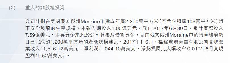 目前俄亥俄州 Moraine 市的汽车玻璃项目已 完成约 1,200 万平方米的产能规模建设。2017 年 1月~6 月,福耀玻璃美国有限公司实现营业收入 11,516.12 万美元,净利润-1,044.10 万美元,净亏损同比大幅收窄(2017 年 6 月实现盈利 49.52 万美元)。