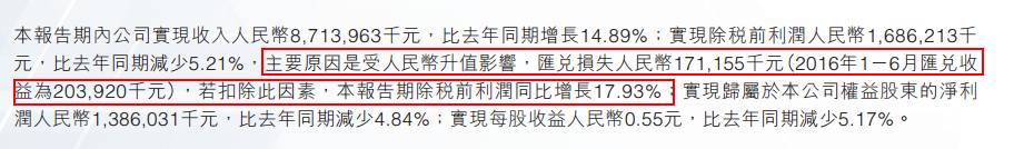 实现利润 总额人民币 168,636.90 万元,比去年同期减少 5.22%,主要原因是受人民币升值影响,汇兑损失 人民币 17,115.48 万元(2016 年 1月~6 月汇兑收益为 20,391.98 万元),若扣除此因素,本报告 期利润总额同比增长 17.91%。