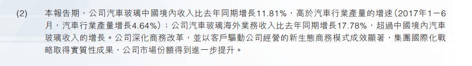 汽车玻璃海外业务收入比去年同期增长17.78%, 超过中国境内汽车玻璃收入的增长。