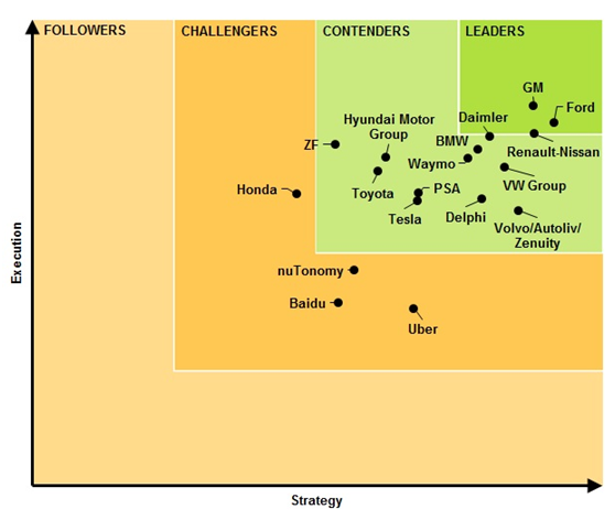 根据Navigant Research第二季度的自动驾驶报告,福特,通用,戴姆勒以及其他汽车制造商是出于领导者的地位,英伟达是主要的处理芯片提供商,英特尔和Mobileye可能是英伟达最大的对手。