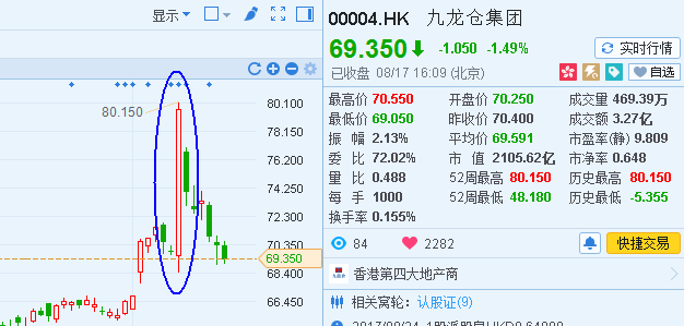 从下图,我们可以看到8月9日当天,分拆消息一出来,九龙仓股价气势如虹,股价飚涨16%。但最近几个交易日,股价已回调到了与消息出来前一样的股价水平。