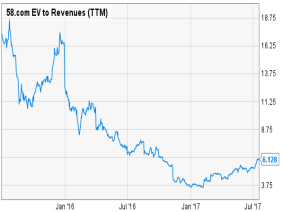 由于公司尚未盈利,58同城这几年的估值一直在缩减。我认为EV /销售比率是较为适当的估值工具,该比例在过去12个月内大幅下滑,并随着58同城股价回升而开始复苏。