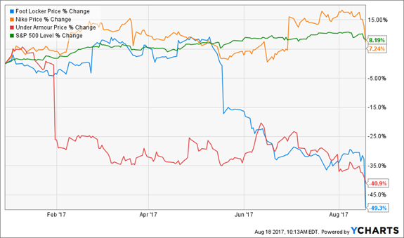 上周五,Foot Locker公布第二季度财报,同店销售不及分析师预期,业绩结果令人失望,股价应声大跌。而耐克(NYSE:NKE)和安德玛(NYSE:UA) (NYSE:UAA)也未能幸免于难。今年以来这两家公司的股价表现一直没什么起色,逊色于标普500指数,Foot Locker的负面消息进一步使其股价承压。