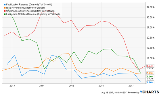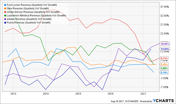 竞争对手Foot Locker令人失望的业绩表现进一步证实了笔者近来对于耐克和安德玛的看法确实没错。耐克和安德玛两家公司的增长都在大幅放缓,而周五发布的关于Foot Locker的消息让笔者相信这可能远不止是个别公司的问题,那问题究竟出在什么地方?是整个行业出现了问题,还是行业内出现其它竞争对手抢占市场份额所致?