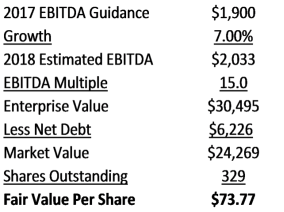 希尔顿拥有一个强劲的未来增长,与万豪非常类似,同时还有更好的EBITDA利润率。希尔顿酒店的RevPAR较低,为107.72美元(表6),在2018年使用7%的EBITDA增长,并使用15x的倍数,与万豪(最接近的同行)保持一致,我计算的企业价值为305亿美元,或每股73.77美元的公允价值(表 7)。