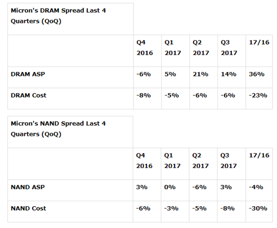 上图是美光披露的一些数据,随着1X节点进入全产能,DRAM成本预计2018年将继续下降20%。根据个人测算,DRAM和NAND价差将会达到58%和46%,美光下季度的财报可能会非常强,如果参照三星和WDC近期披露的数据。