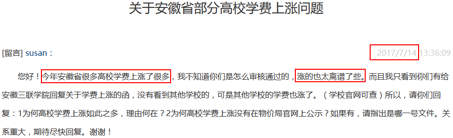 而在网上也可看到,7月份已有市民向安徽省物价局投诉高校学费上涨过于离谱。