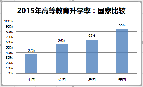 中国2015年的高考本科录取率在37%左右,远低于其他国家。