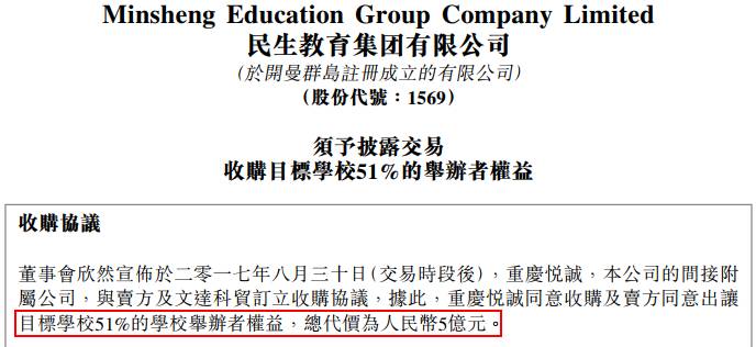 中报后一天,民生教育发公告称:以人民币5亿元向文达集团收购文达信息工程学院、安徽信息技术学院和安徽蓝天飞行学院三所学校51%的股权。