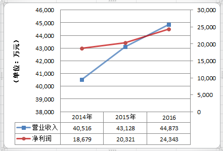 营业收入从2014年的4.05亿人民币(单位下同)增长到2016年的4.49亿,复合增长率为5.24%;
