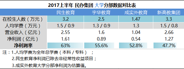 可以看到,民生教育的利润率仍一骑绝尘,宇华教育和成实外教育大学分部、新高教集团的利润率也徘徊在50%,和民生教育的63%仍有10%以上的差距。